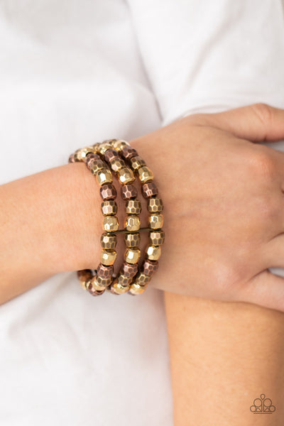 Held together with dainty brass fittings, rows of faceted brass, copper, and gold beads are threaded along stretchy bands around the wrist, coalescing into bold layers.