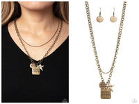 Featuring three inspirational pendants, a brass star, circle, and square fall along a brass chain. The star features the phrase "own it," the circle features the phrase "one of a kind," and the square pendant features the phrase "masterpiece in progress." Hanging just above the inspiring collection, a brass ball chain creates an additional layer to the monochromatic design. Features an adjustable clasp closure.