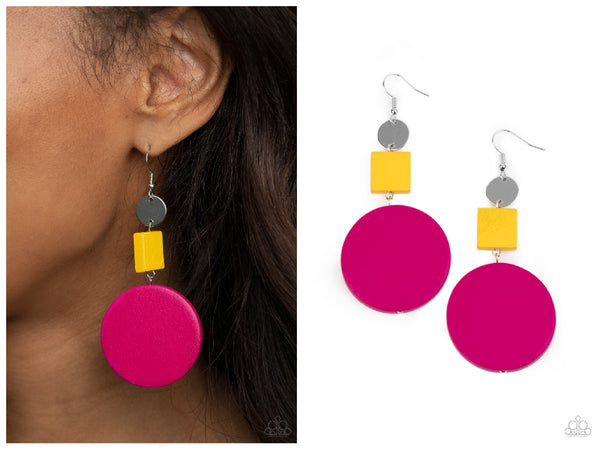 A shiny silver disc, yellow wooden square, and oversized pink wooden circle delicately link into a colorfully retro lure for a trendsetting finish. Earring attaches to a standard fishhook fitting.
