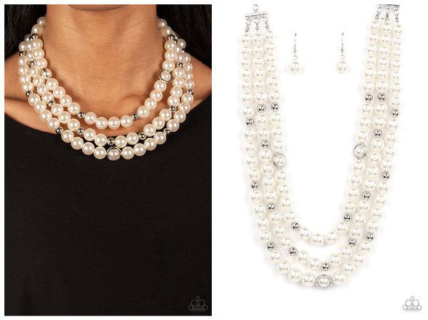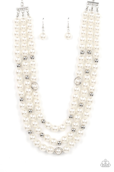 Infused with silver beads and silver rings, a bubbly collection of white pearls are threaded along invisible wires that cascade into effervescent layers below the collar. Features an adjustable clasp closure.