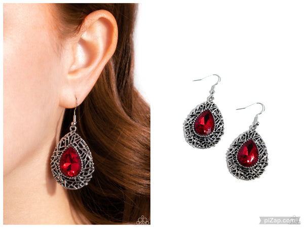Encased in a pronged silver frame, an oversized red teardrop gem is pressed into the center of silver twig-like bars that stack into an airy teardrop frame for an edgy glamour. Earring attaches to a standard fishhook fitting.