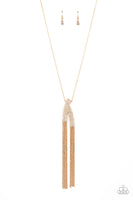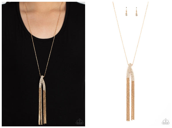 Flat gold chains stream out from the bottom of two overlapping white rhinestone encrusted frames, creating a timelessly twinkling pendant at the bottom of a lengthened gold snake chain. Features an adjustable clasp closure.