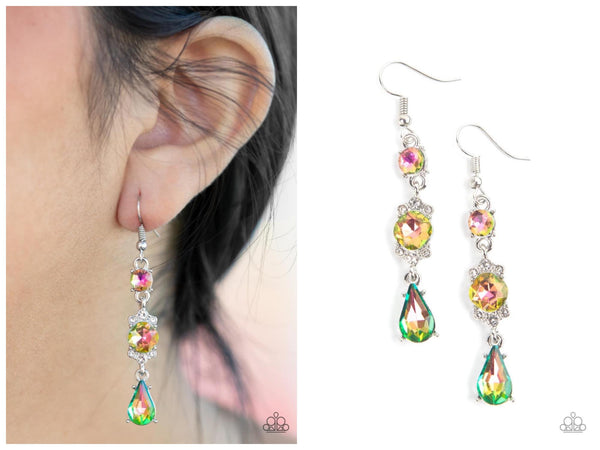Featuring a white rhinestone encrusted frame, an oversized multi rhinestone is linked between a classic round and teardrop multi rhinestone for an elegantly stacked look. Earring attaches to a standard fishhook fitting.
