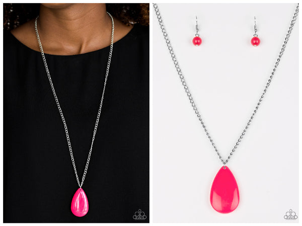 A vivacious pink teardrop pendant swings from the bottom of a lengthened silver chain, adding a perfect pop of color to any outfit. Features an adjustable clasp closure.