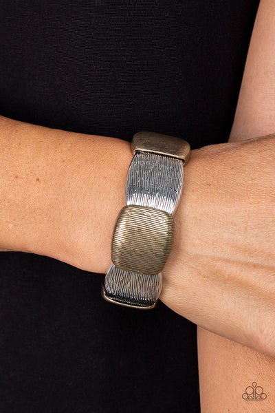 Scratched in a rustic linear pattern, mismatched brass and silver block-like frames delicately overlap along stretchy bands around the wrist for an artisan inspired style.