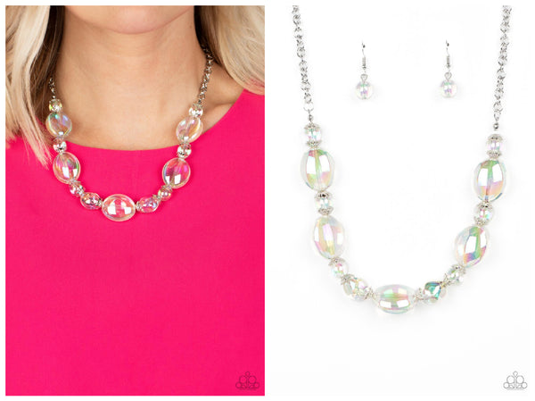Clasped between silver accents dainty and large bubbly iridescent beads drape around the collar, creating a glittery magical effect. Features an adjustable clasp closure. Due to its prismatic palette, color may vary.