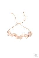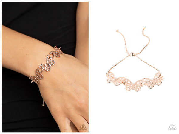 Featuring airy stenciled cutouts, three rose gold butterflies delicately connect at the center of a rose gold box chain for a whimsical fashion. Features an adjustable sliding bead closure.