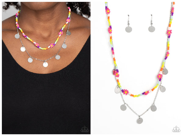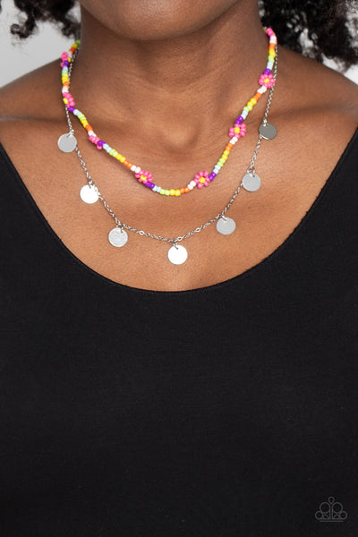 Multicolored seed beads are threaded along a wire, falling along the collar in a capricious pattern. Creating additional charm to the design, Pink Peacock seed bead flowers bloom amongst the bright pops of color. A delicate silver chain, infused with twinkling silver discs, layers with the colorful beads for a sassy, yet sweet, combo. Features an adjustable clasp closure.