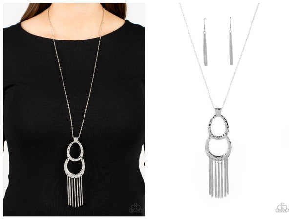 A hammered silver horseshoe links to the bottom of a hammered oval frame at the bottom of a lengthened silver chain. Glistening silver chains stream out from the bottom of the stacked pendant, adding eye-catching movement to the rustic centerpiece. Features an adjustable clasp closure.