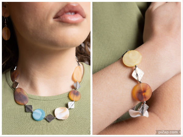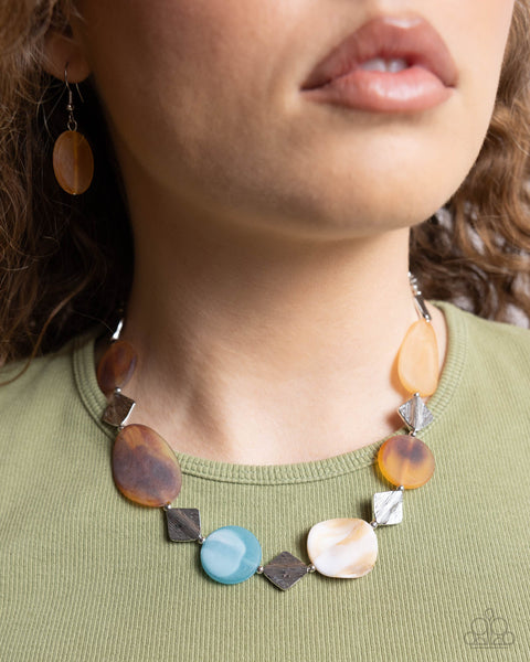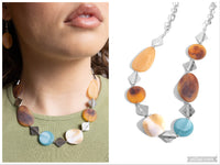 Attached to an abstract silver chain, a collection of textured diamond silver beads, round silver beads, clear blue, brown swirled, and white swirled with brown beads in varying shapes coalesce below the neckline for an artistic, animated look. Features an adjustable clasp closure.