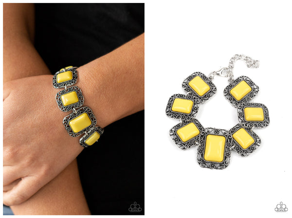 A flirty collection of Illuminating rectangular beads are bordered by rustic floral filigree filled frames as they delicately link around the wrist for a whimsical flair. Features an adjustable clasp closure.