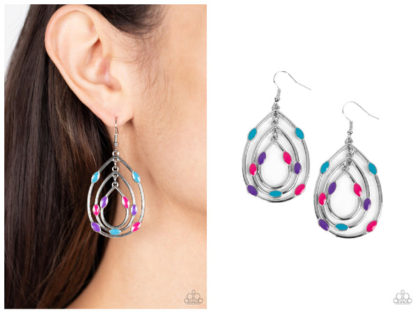 Featuring flattened blue, purple, and Fuchsia Fedora accents, three shimmery silver teardrop frames delicately link into a layered lure for a colorful look. Earring attaches to a standard fishhook fitting.