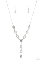 White rhinestone encrusted oval and teardrop silver frames delicately link with matching topaz rhinestone dotted frames below the collar. Matching frames trickle from the center, creating an elegant extended pendant. Features an adjustable clasp closure.