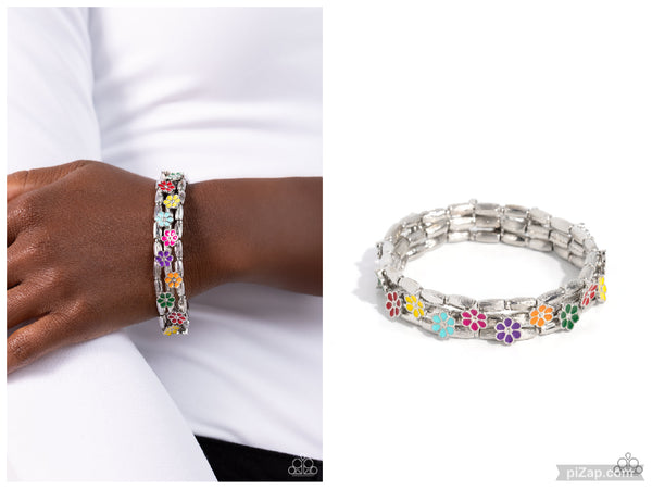 Held together by dainty multicolored flowers, rows of linear-textured cylindrical silver beads are threaded along stretchy bands around the wrist, coalescing into bold, whimsical layers.