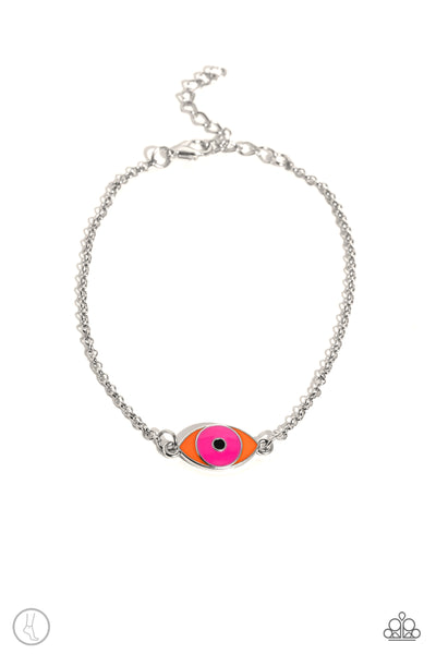 Featuring a glassy eye-like design, a shimmery silver charm with accents of orange, pink, and black attaches to a dainty silver chain around the ankle for a summery look. Features an adjustable clasp closure.