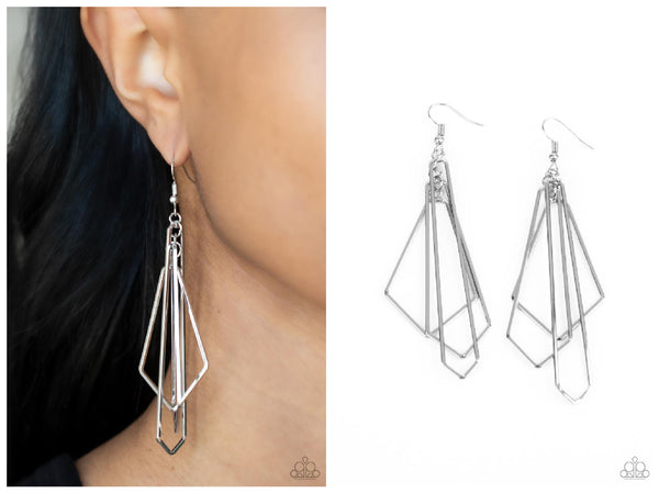 A mismatched collection of flared geometric silver frames link into a layered lure, creating an edgy metallic tassel. Earring attaches to a standard fishhook fitting.