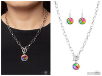 A dramatic gem with a UV shimmer swings from the bottom of a shiny silver chain, creating a blinding pendant below the collar. Features a toggle closure. Due to its prismatic palette, color may vary.