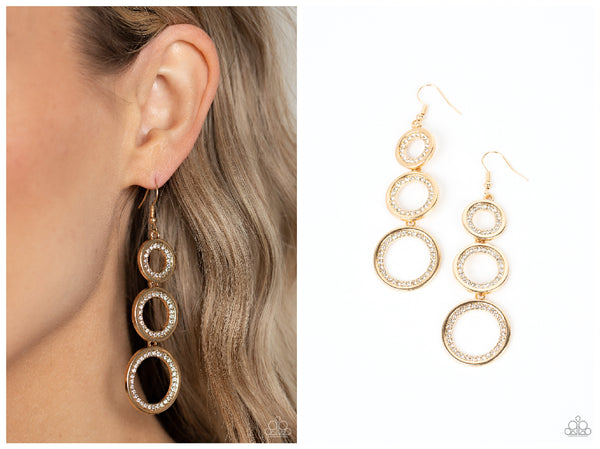 Gradually increasing in size, inner rings of white rhinestones radiate inside glistening gold hoops that link into an elegant lure. Earring attaches to a standard fishhook fitting.