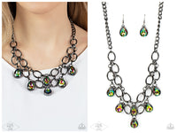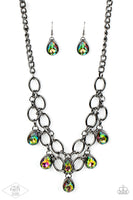 Joined by dainty gunmetal links, two rows of dramatic gunmetal chain layer below the collar in a fierce fashion. Oil spill teardrop gems drip from the glistening layers, adding a timeless shimmer to the show-stopping piece. Features an adjustable clasp closure.