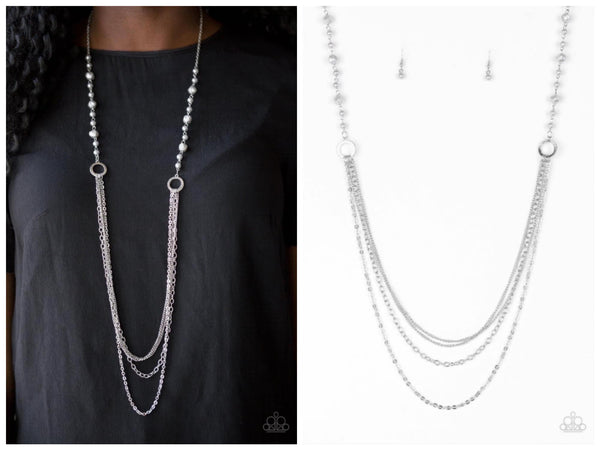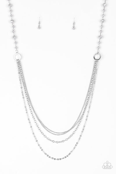 Dainty silver pearls and imperfect silver pebble-like beads give way to layers of mismatched silver chains. Silver studded rings attach to the glistening layers, flawlessly draping the chain across the chest for an elegant look. Features an adjustable clasp closure.