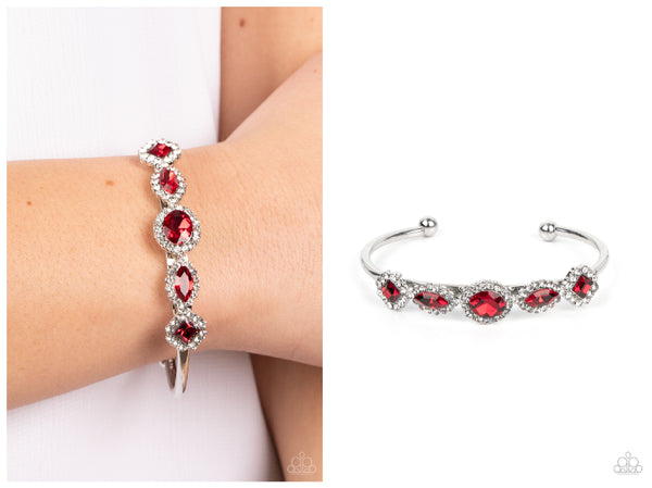 Bordered in glassy white rhinestones, mismatched red gems alternate across the front of a dainty silver cuff for a sparkly fashion.