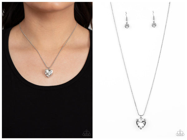 A heart-shaped rhinestone brushed in a white finish sparkles brilliantly as it slides along a skinny silver snake chain. The gem is pressed into a thick silver frame, allowing its faceted surface to be emphasized. Features an adjustable clasp closure.
