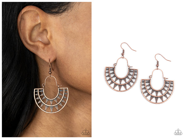 Two rows of antiqued copper triangular frames curve into a stacked sunburst pattern, creating a radiantly rustic lure at the bottom of a dainty copper wire fitting. Earring attaches to a standard fishhook fitting.