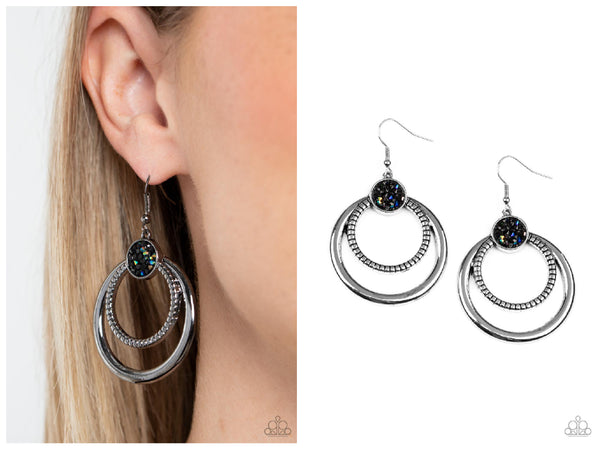 Smooth and textured silver hoops connect to the bottom of a silver fitting embellished in glitzy oil spill and hematite rhinestones, creating a dizzying lure. Earring attaches to a standard fishhook fitting.