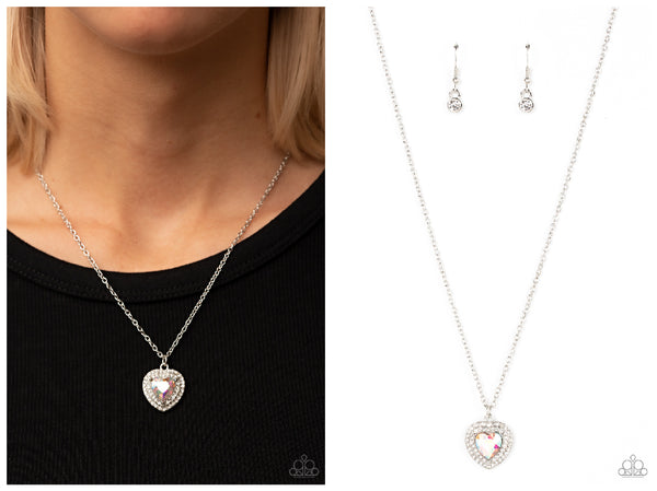 Bordered in stacked rows of glassy white rhinestones, a twinkly iridescent heart shaped gem sparkles at the center of a dainty silver chain for a flirtatious fashion. Features an adjustable clasp closure.