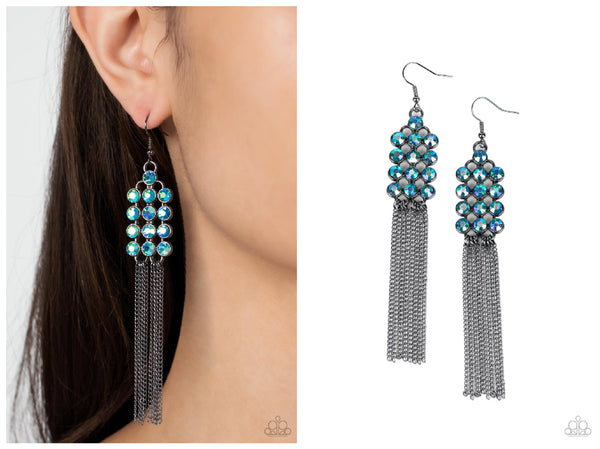 Encased in sleek hematite fittings, rows of glittery multi-colored oil spill rhinestones stack into a sparkly frame. Dainty gunmetal chains stream from the bottom of the dazzling frame, adding flirtatious movement to the timelessly tasseled display. Earring attaches to a standard fishhook fitting.