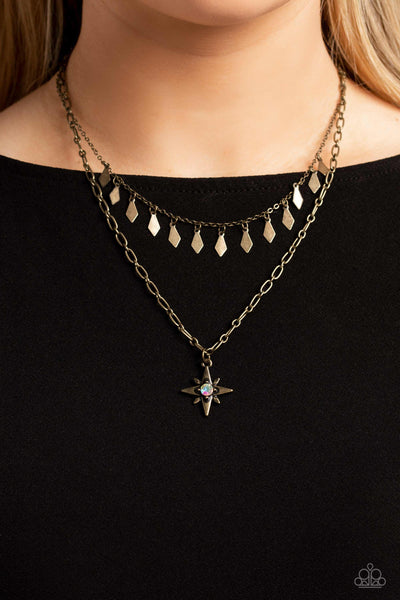 A three-dimensional brass star, dotted with a single iridescent rhinestone glides on a paperclip chain down the neckline for an out of-this-world-vibe. Flat and flared brass frames dance above the star pendant from an uppermost chain, adding a gritty layered look to the refined palette. Features an adjustable clasp closure. Due to its prismatic palette, color may vary.