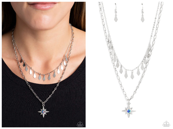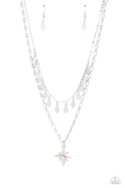 A three-dimensional silver star, dotted with a single orange-iridescent rhinestone glides on a paperclip chain down the neckline for an out of-this-world vibe. Flat and flared silver frames dance above the star pendant from an uppermost chain, adding a shimmery layered look to the refined palette. Features an adjustable clasp closure. Due to its prismatic palette, color may vary.