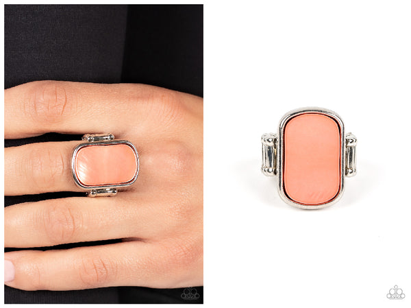 An oversized rectangular coral pearlescent shell is encased in a simple silver frame resulting in a refreshingly tranquil centerpiece atop the finger. Features a stretchy band for a flexible fit.