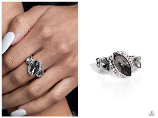 Flanked by two dainty silver curls encrusted in glassy white rhinestones, three tilted, glassy smoky marquise-cut rhinestones, in varying sizes, embellish a shimmery silver band for a refined flair atop the finger. Features a dainty stretchy band for a flexible fit.