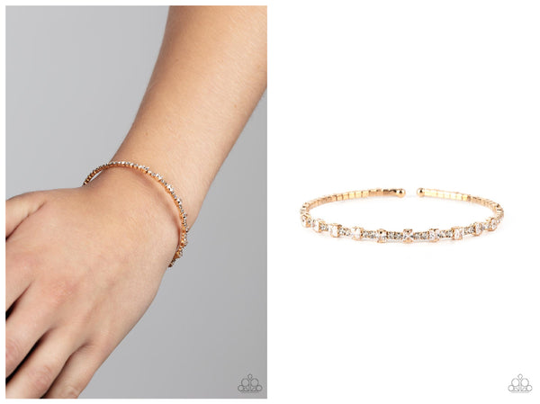Featuring sleek gold fittings, a classic band of dainty white rhinestones is interrupted with square cut white rhinestones, adding a timeless twist to the stackable cuff.