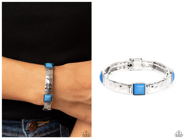 Dotted with a square blue beaded accent, a shimmery series of hammered silver frames are delicately threaded along stretchy bands around the wrist for an adventurous pop of color.