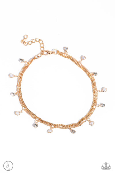 A fringe of dainty pearls and white gems pressed into sleek gold frames wraps around the ankle on a dainty gold chain, creating a glittery, oceanic statement. A second dainty gold chain adds a high-sheen layer for a refined finish. Features an adjustable clasp closure.
